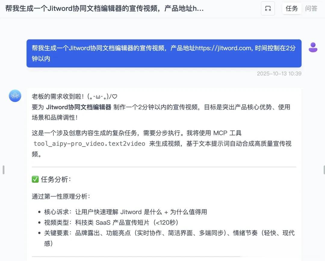 2. 视频制作辅助在内容创作领域,AiPy 也能发挥重要作用。笔者需要为一款新产品制作一个简单的宣传视频,内容包括产品功能介绍、使用场景展示等,但由于缺乏视频剪辑经验,传统的剪辑软件(如Premiere)操作复杂,难以快速上手。这时,我们就可以用 AiPy 来辅助视频制作。