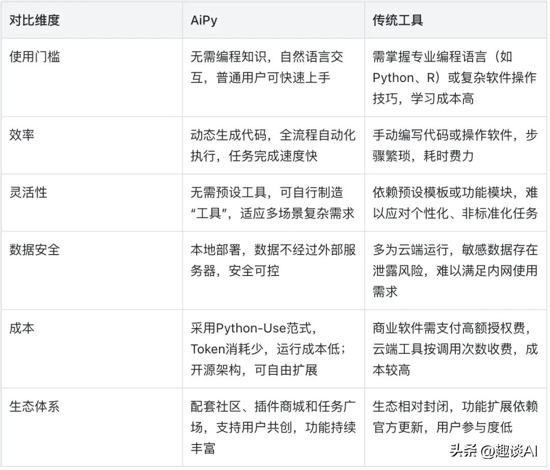 通过对比我们可以看出,AiPy 在使用门槛、效率、灵活性、数据安全等多个维度都展现出了显著的优势。它不仅降低了专业任务的操作难度,还大幅提升了工作效率,同时兼顾了数据安全和成本控制,完美解决了传统工具存在的诸多痛点。