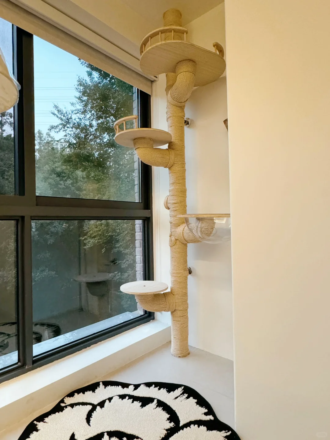 网友@Sopi 的分享:装修的时候我就想将阳台的下水改成猫爬架,这个位置和大小真的非常合适,装修完了我就买来牛皮纸绳将下水管包起来做成了猫爬架,都省了买猫爬架的钱了。