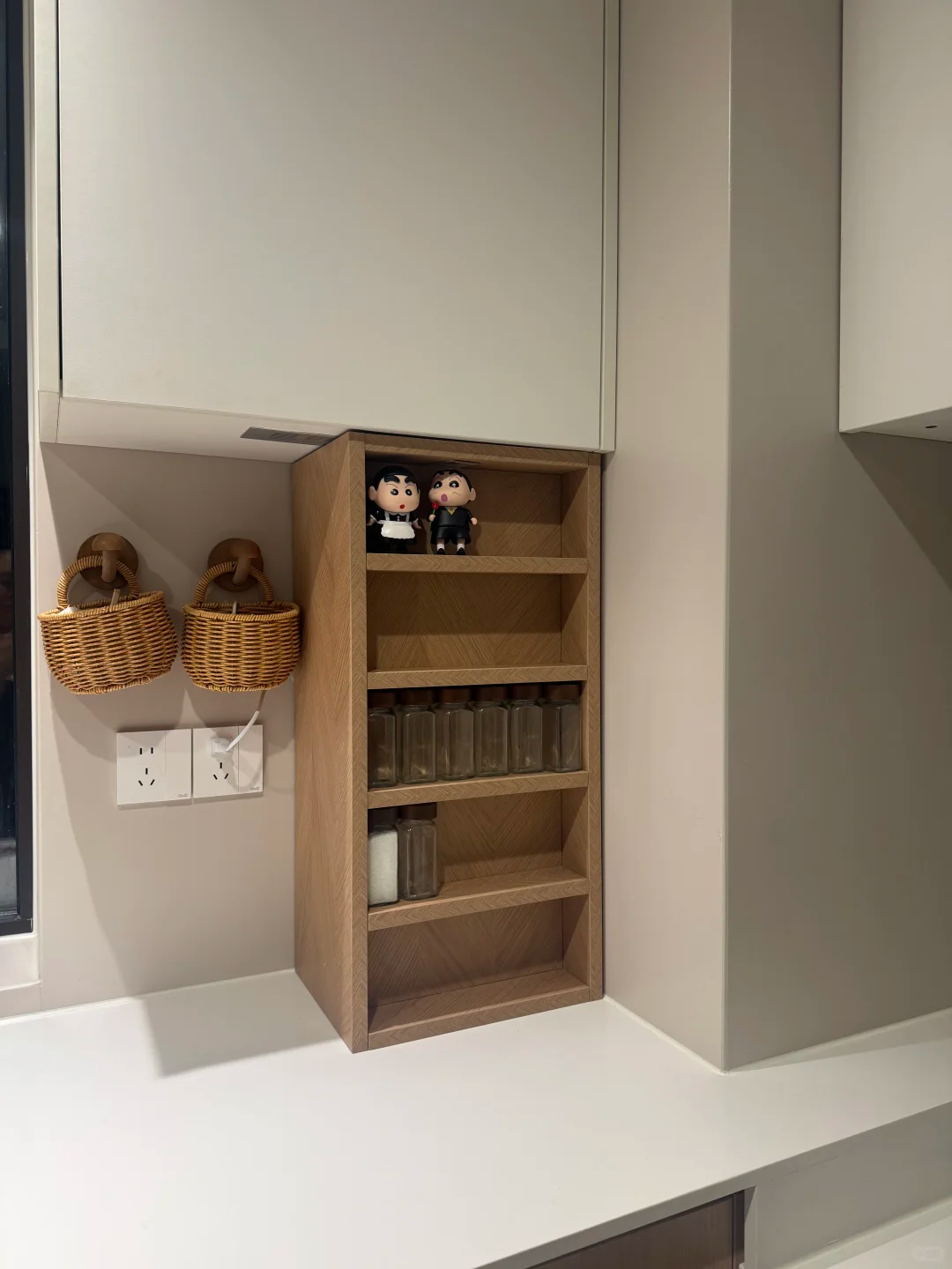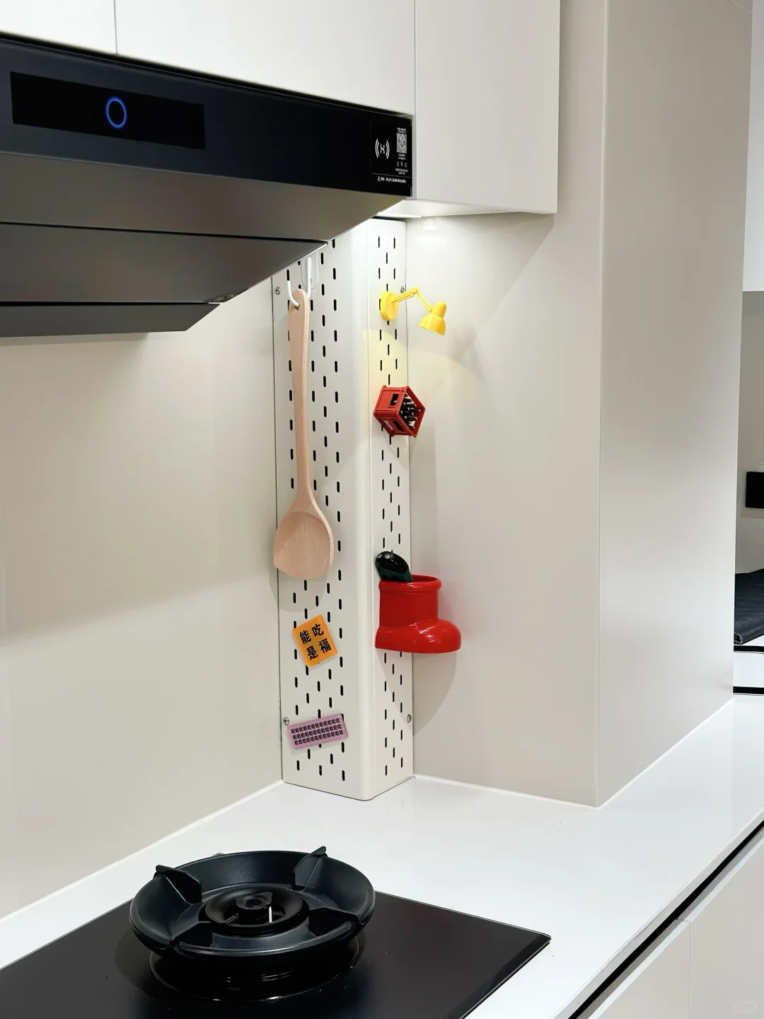 除了用洞洞板,还有网友选择了定制的小调料架作为遮挡,也非常的使用,而且还很可爱。
