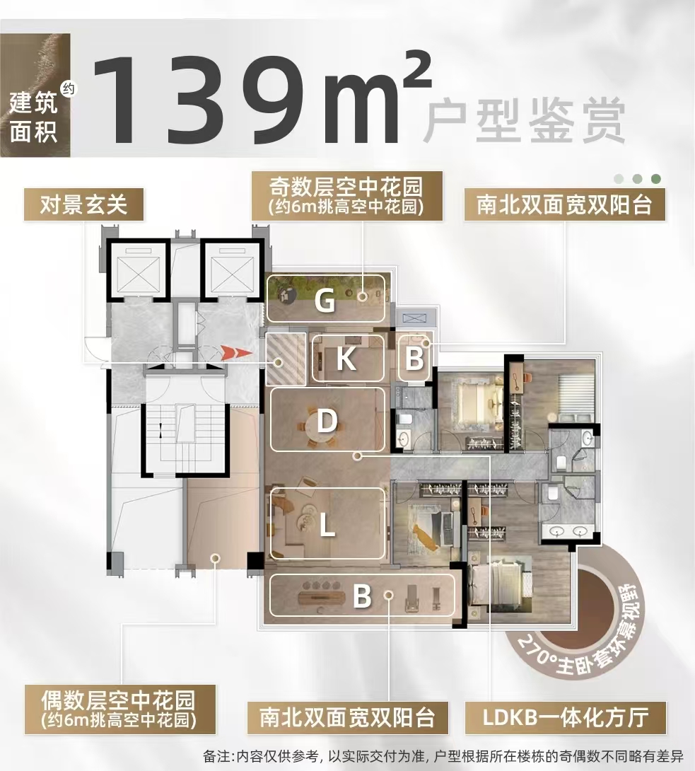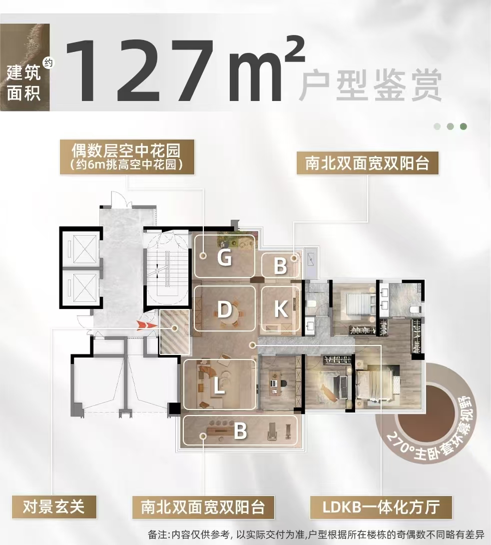 大平层“云璟组团”,涵盖127-170㎡四房,核心亮点是“6米挑高空中花园+超高得房率”,且奇偶层户型略有差异。