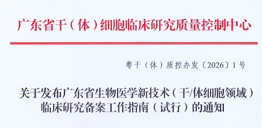 广东省干(体)细胞临床研究质量控制中心在2026年2月11日发布了《广东省生物医学新技术(干/体细胞领域)临床研究备案工作指南(试行)》。