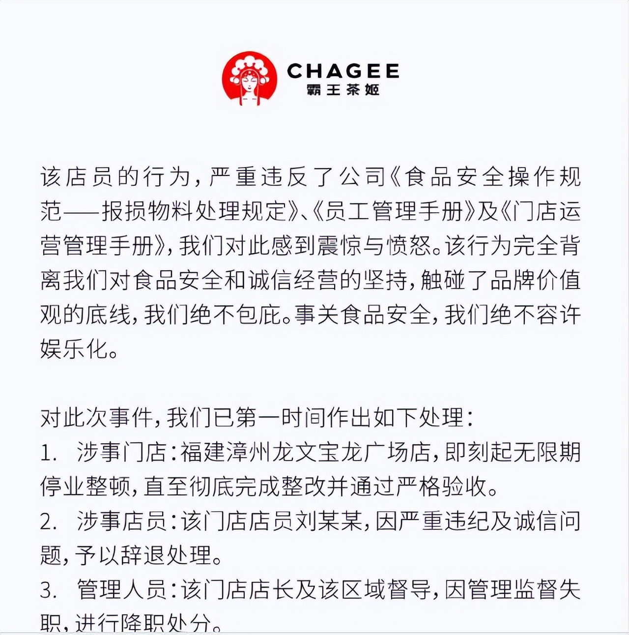 门店店长、区域督导因管理监督失职被降职,涉事门店即刻起无限期停业整顿。