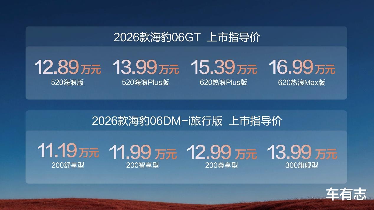 日前,比亚迪海洋网举行发布会,同时推出2026款海豹06GT与2026款海豹06DM-i旅行版两款新车。前者售价12.89万-16.99万元,后者售价11.19万-13.99万元。两款新车分别切入高性能纯电两厢轿跑与超混旅行车两大细分赛道,构成了一组精准的战略组合拳。