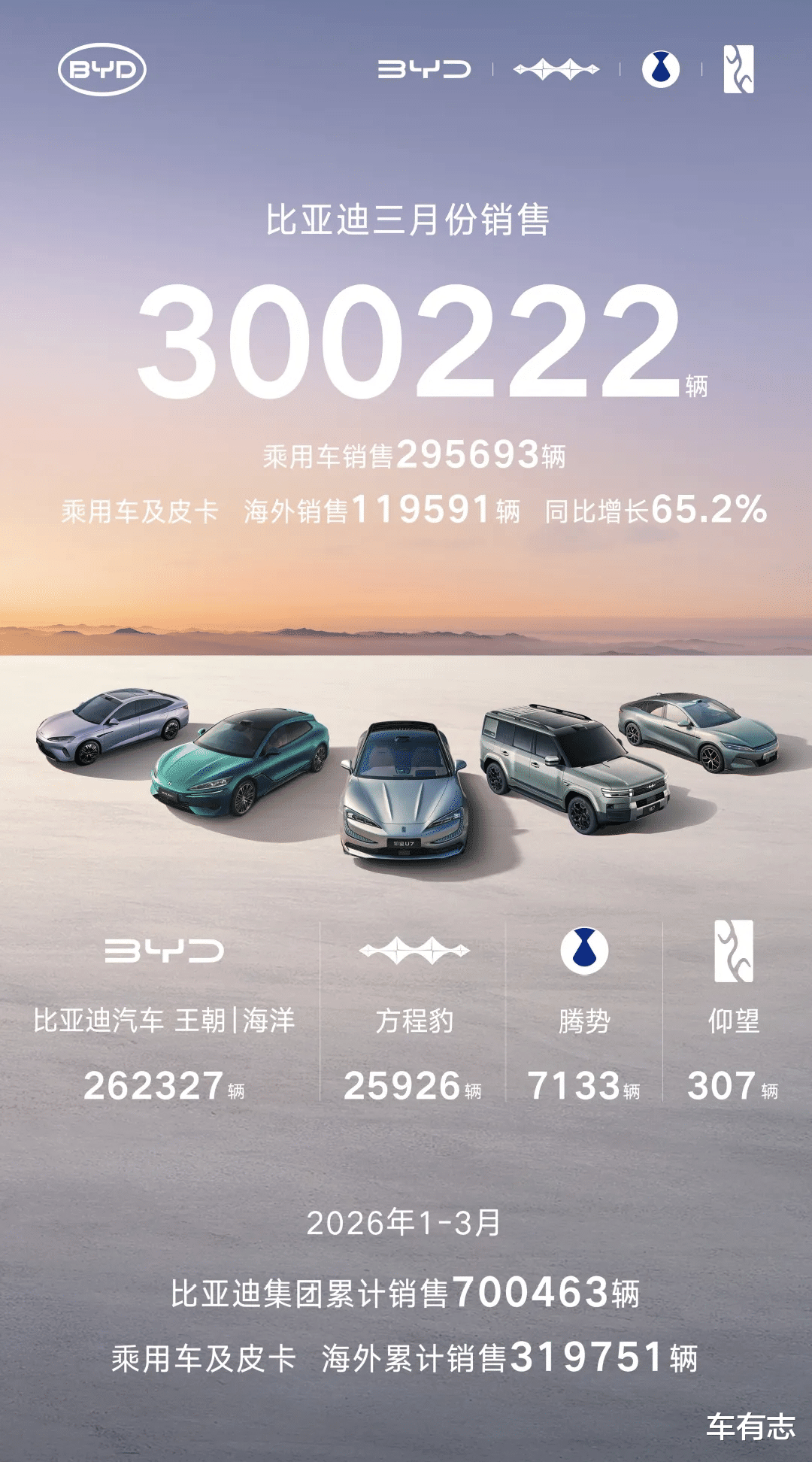 而就在前一天,比亚迪刚刚交出了2026年3月的销量成绩单。据比亚迪发布的公告,2026年3月其新能源汽车销量为300222辆,环比增长约57.8%,强势站上30万辆关口,连续第58个月蝉联中国新能源汽车销量冠军。其中乘用车及皮卡海外销售119591辆,同比增长65.2%,海外销量已连续五个月稳定在10万辆以上,占总销量近四成。今年1-3月,比亚迪集团累计销售700463辆,海外累计销售319751辆。