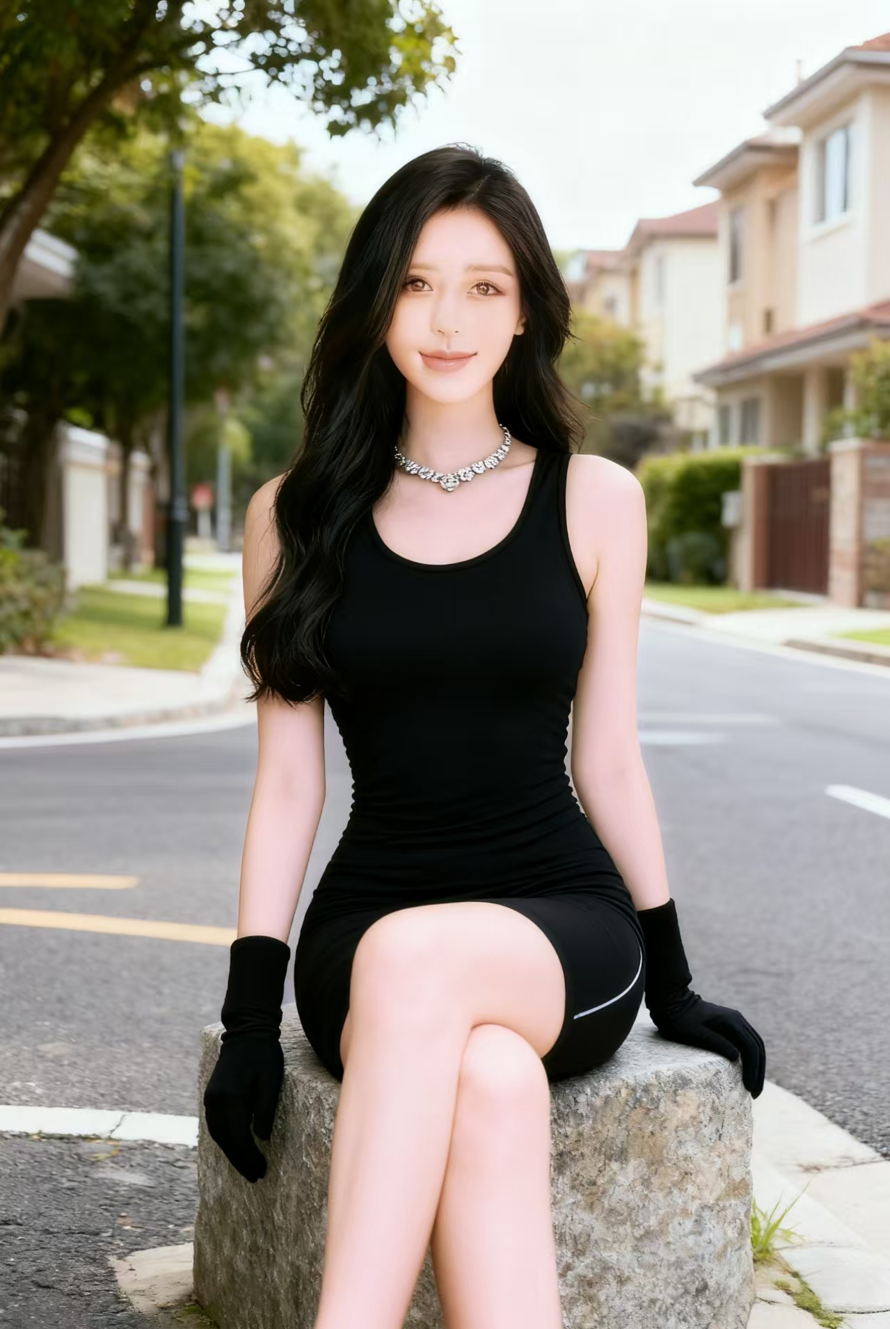 裙子长度及膝,版型修身,凸显身材比例。她搭配了一对黑色无指手套,长度覆盖到手腕,增添了时尚感和个性元素。