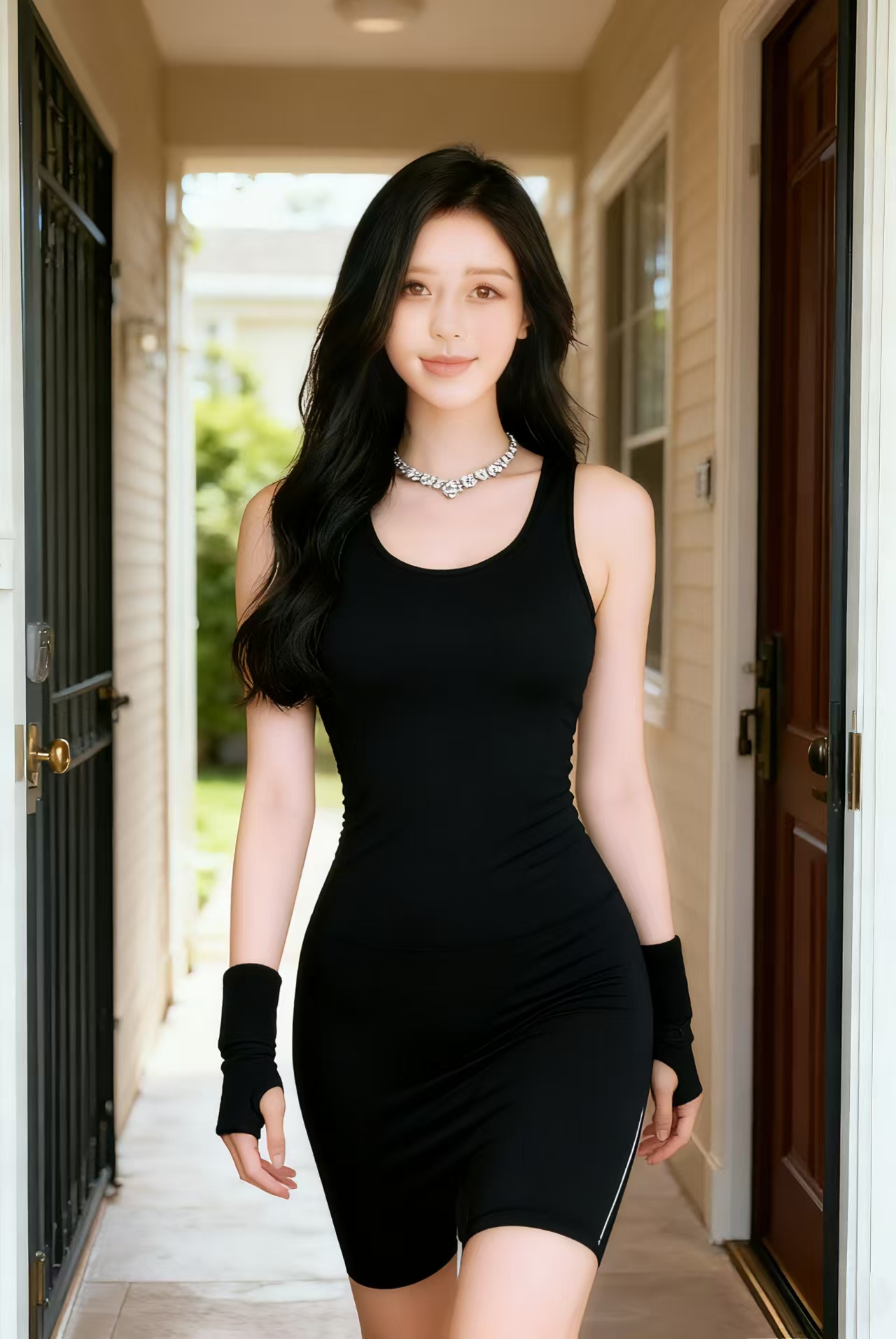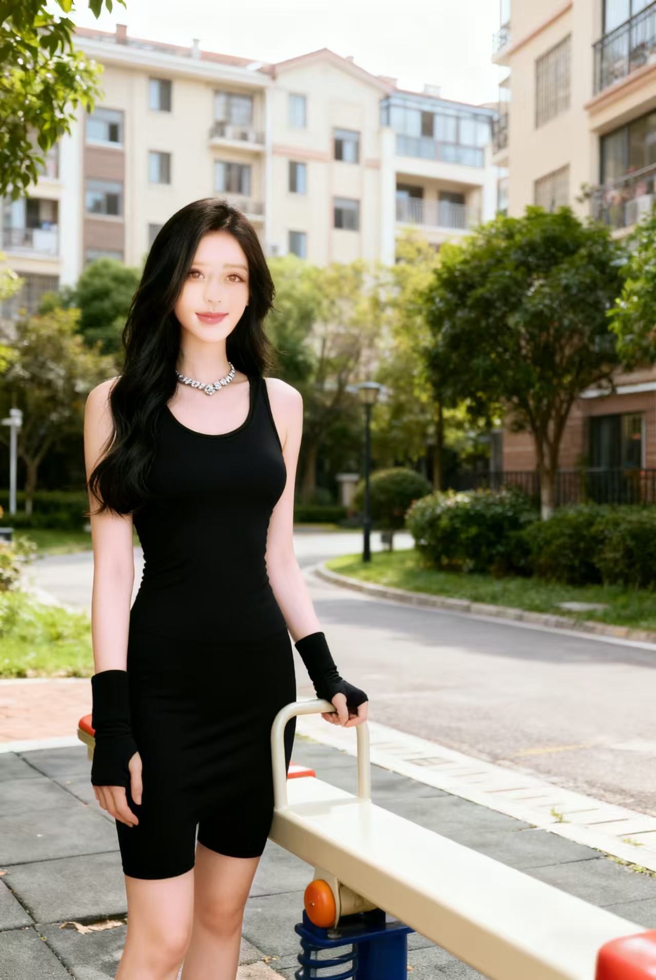 一件黑色无袖紧身连衣裙,采用圆领设计,面料贴身有弹性,勾勒出流畅的身体曲线。