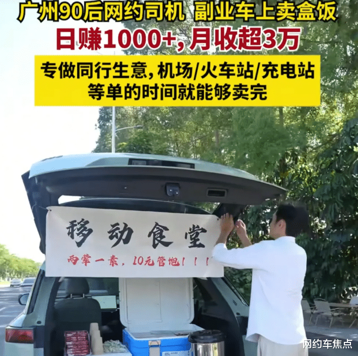但这些规定拦不住司机们搞钱的心。有师傅在车上卖大米,后备箱塞几袋,乘客顺路带一袋回家。有师傅卖特产,跑长途的时候带点老家干货,乘客感兴趣就买。还有人卖玩偶、卖零食,甚至有人直接在充电站旁边支个摊卖早餐,收摊了再去跑车,主业副业两不误。