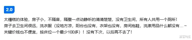 吐槽最多的是隔音问题。“房子小,不隔音,隔壁一点动静听的清清楚楚,没有卫生间,所有人共用一个厕所!房子去卫生间很远,洗衣服(没地方凉,阳台也没有,衣架也没有,房间拖鞋,洗漱用品什么都没有。”
