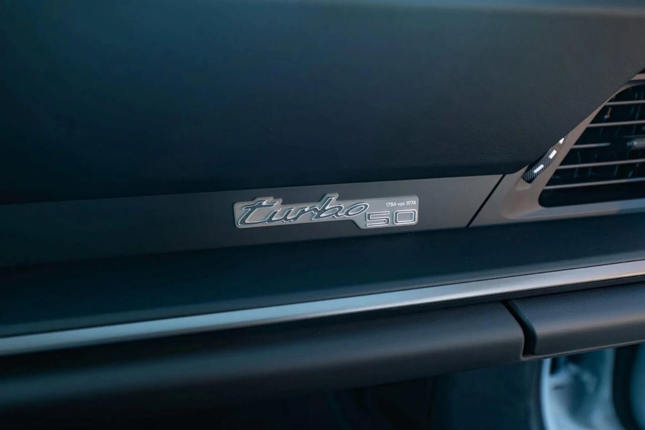 内饰的专属设计与豪华配置同样诚意拉满,中控台镶嵌专属纪念铭牌,直接彰显其限量版身份。主驾副驾均配备18向电动调节运动增强型座椅,黑色真皮包裹搭配格纹织物拼接,座椅头枕处还绣有“Turbo 50”专属标识,经典与精致兼具。