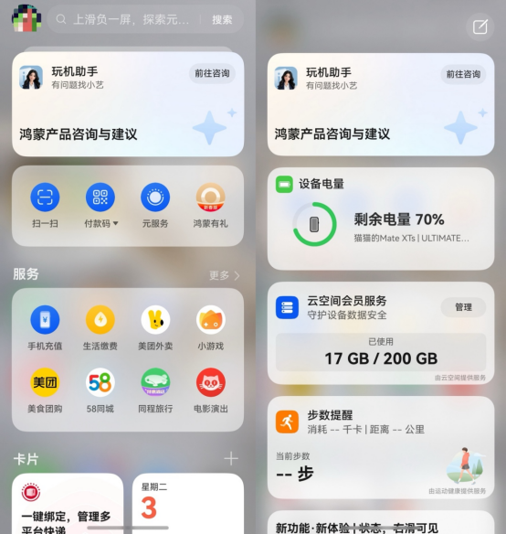 在手机主屏幕向右滑动,进入“负一屏”,在顶部的动态服务卡片区里,就能看到“鸿蒙产品咨询与建议”这张卡片。第一眼没看到也别慌,因为卡片是动态轮播的,上下滑动卡片,或者点击卡片展开卡片列表,就一定能找到。