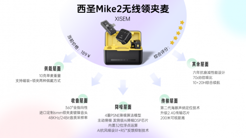 西圣Mike2麦克风专注于打造发烧级性能体验,去除多余功能和型号,专注于一款产品的持续优化。历经数十次升级,优化了200多个性能细节,音质表现、连接稳定性、耐用性均远超竞品。它独创10大黑科技,包括加强版全指向AI感知麦克风、发烧级AI降噪DSP芯片、第二代ALPT高密度拾音技术、4重PSNE降噪算法模型和自研RS™反馈抑制技术等。这些技术使麦克风声音清晰度高达98%,抗噪性达96%,收音效果和稳定性达到旗舰级水准。凭借超高性价比,西圣Mike2在千元以内市场备受好评,被媒体誉为“平价麦克风天花板”。