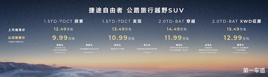 3月7日,以“自由”为主题的“捷途自由者全国上市发布会”在成都举行。活动中,“公路旅行越野SUV”捷途自由者正式上市,共推出4款车型,价格分别为:1.5TD-7DCT探索12.49万元、1.5TD-7DCT发现13.49万元、2.0TD-8AT穿越14.49万元、2.0TD-8AT XWD征服15.49万元。针对女性用户,捷途自由者全系车型还特别推出“星月女神”,价格13.89万元。此外,捷途还为消费者带来七重超值权益,包括膨胀礼、焕新礼、减压礼、安心礼、畅玩礼、试驾礼和露营礼,综合价值高达4万元,以亲民价格和全能实力,为年轻用户开启“可城可野”的旅行新体验。