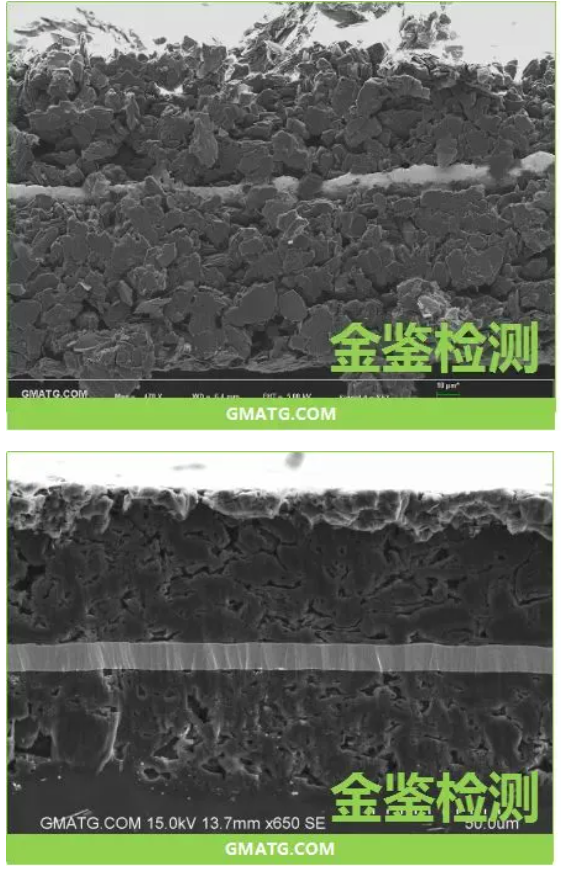 截面分析锂电池材料的性能与其内部结构密切相关。氩离子抛光技术可用于制备锂电池正负极材料的截面样品。通过观察其内部结构和孔隙度,研究人员可以评估材料的吸液性和循环寿命。与传统的金相研磨抛光相比,氩离子抛光技术能够更有效地去除表面损伤层,提供更清晰的截面图像。这对于锂电池材料的研发和质量控制具有重要意义,能够帮助研究人员更好地理解微观结构与性能之间的关系,为开发高性能锂电池提供技术支持。下图是抛光前后对比图: