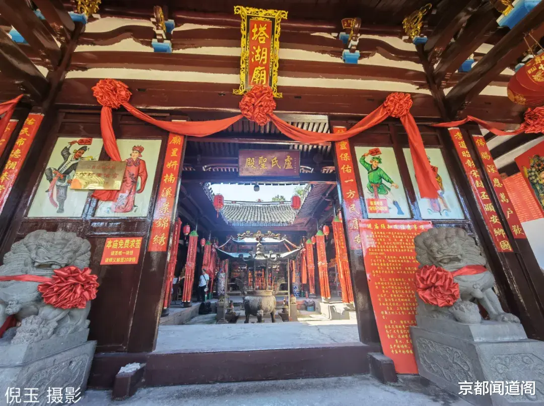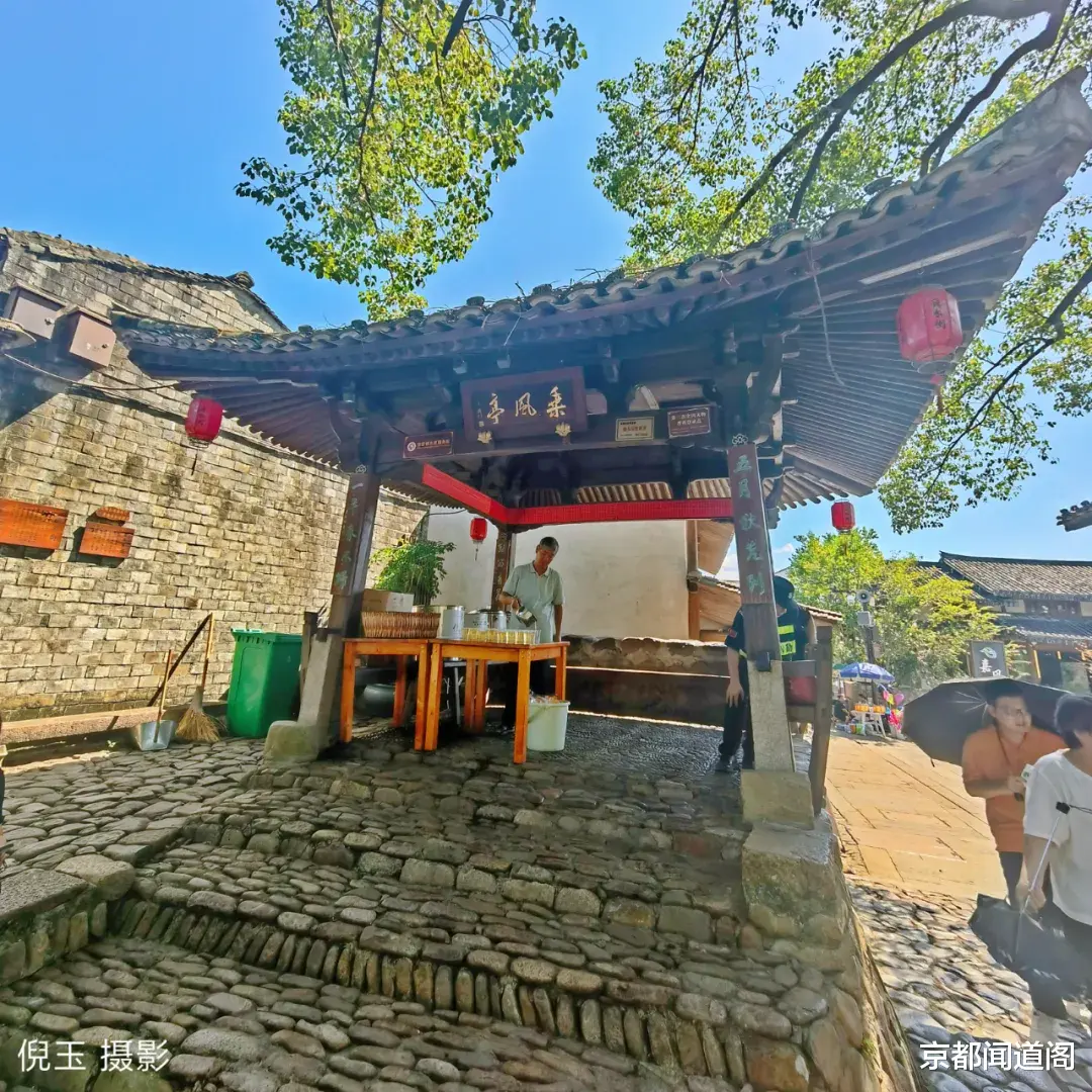 离樟树不远处,玲珑别致的接官亭静静矗立。这座始建于明嘉靖三十五年的省级文保单位,内四柱外四柱,方形重檐攒顶下,五层斗拱叠成八角藻井,隐喻五行八卦。八条屋脊上立着“张果老骑白驴”塑像,脊端雕塑“刘海献钱”图案,结构严密又朴实无华,亭中“名师留奇迹,怪匠逗行人”的对联,更添几分文人雅趣。