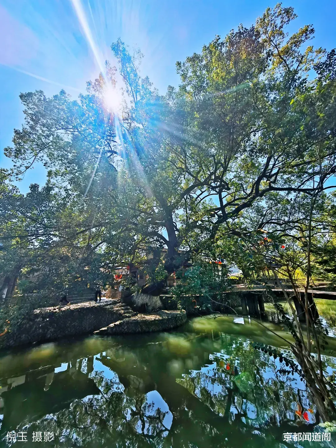 丽水街坐落于温州永嘉岩头镇东缘的蓄水堤上,又名丽水长廊,是楠溪江流域极具代表性的古村景点。随水势蜿蜒,檐下一个个红灯笼和参天古树绿影相映,尽显古朴与惬意。这座依托水利设施兴起的村落,从元朝起便承载着古人的治水智慧,当地百姓引山溪入村,让流水贯穿街巷,“水如棋局分街陌,山似屏帏绕画楼”是对丽水街最好的写照。漫步在这秀美的风景里,宛如走进一座没有围墙的“古建筑博物馆”,300多米长的街道上,90多间两层楼老店鳞次栉比,2米多宽的鹅卵石步道被岁月磨得温润,踏上去发出不同的声响,像是穿越古今的对话。有可能是溪水流动,有可能是绿树成荫,有可能是走在长廊里,还有可能是太投入的缘故……上午正在不断爬高的温度也被忽略了。