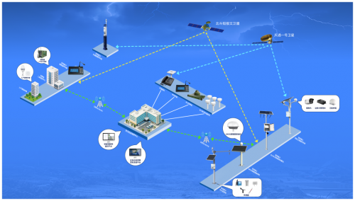 前端部署水文监测站、GNSS高精度接收机、低轨卫星图传系统和智能传感器等设备,采集雨量、水位、地质形变等多源数据;数据经卫星或地面链路,实时传输至防汛监测预警中心。