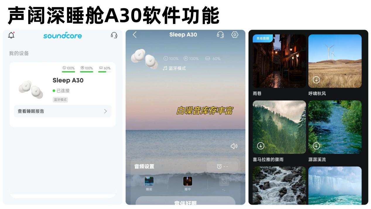 声阔深睡舱A30的APP界面简单易用,可以大致查看睡眠情况,还提供一些白噪音选项,配合耳机用能让入睡环境更安静舒适。