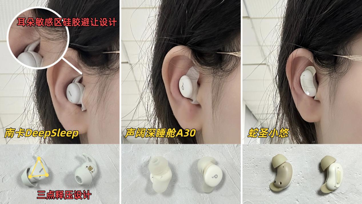 睡眠耳机最重要的就是整晚戴着也能轻松舒适。我把南卡DeepSleep、声阔深睡舱A30和蛇圣小悠都实际佩戴过一整晚,还邀请了不同耳型的朋友一起体验。重点观察了耳机材质的柔软度、与耳廓的贴合情况,以及侧睡和翻身时的稳固性——耳机不能顶耳朵,也不能轻易滑动。只有满足这些条件,整晚佩戴才能真正安稳,不影响休息,也不会被耳机本身打扰到入睡。