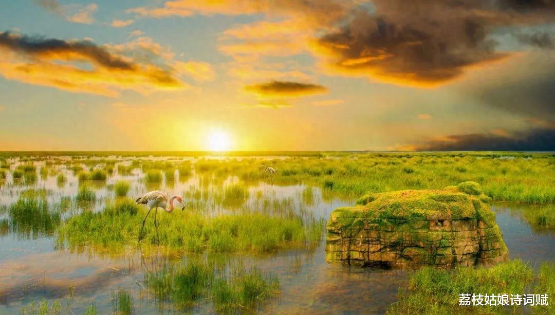 一只白鹤孤独地栖息在沙地上,而两只萤火虫则在水中翩翩起舞,相互辉映。这里诗人通过白鹤和萤火虫的对比,一种孤独和热闹的对立,诗人在困境中寻找美和乐趣的人生态度。