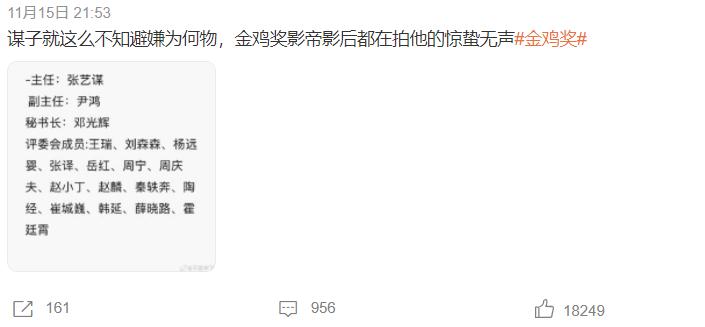 颁奖典礼结束后,很多网友才发现,本届金鸡奖评委会主任是张艺谋,看到这样的消息,大家都觉得很正常,因为张艺谋是知名导演,完全有资格成为评委会主任,但巧的是,易烊千玺和宋佳是张艺谋新电影《惊蛰无声》主演,也就是说,影片中的男主和女主都获奖了。
