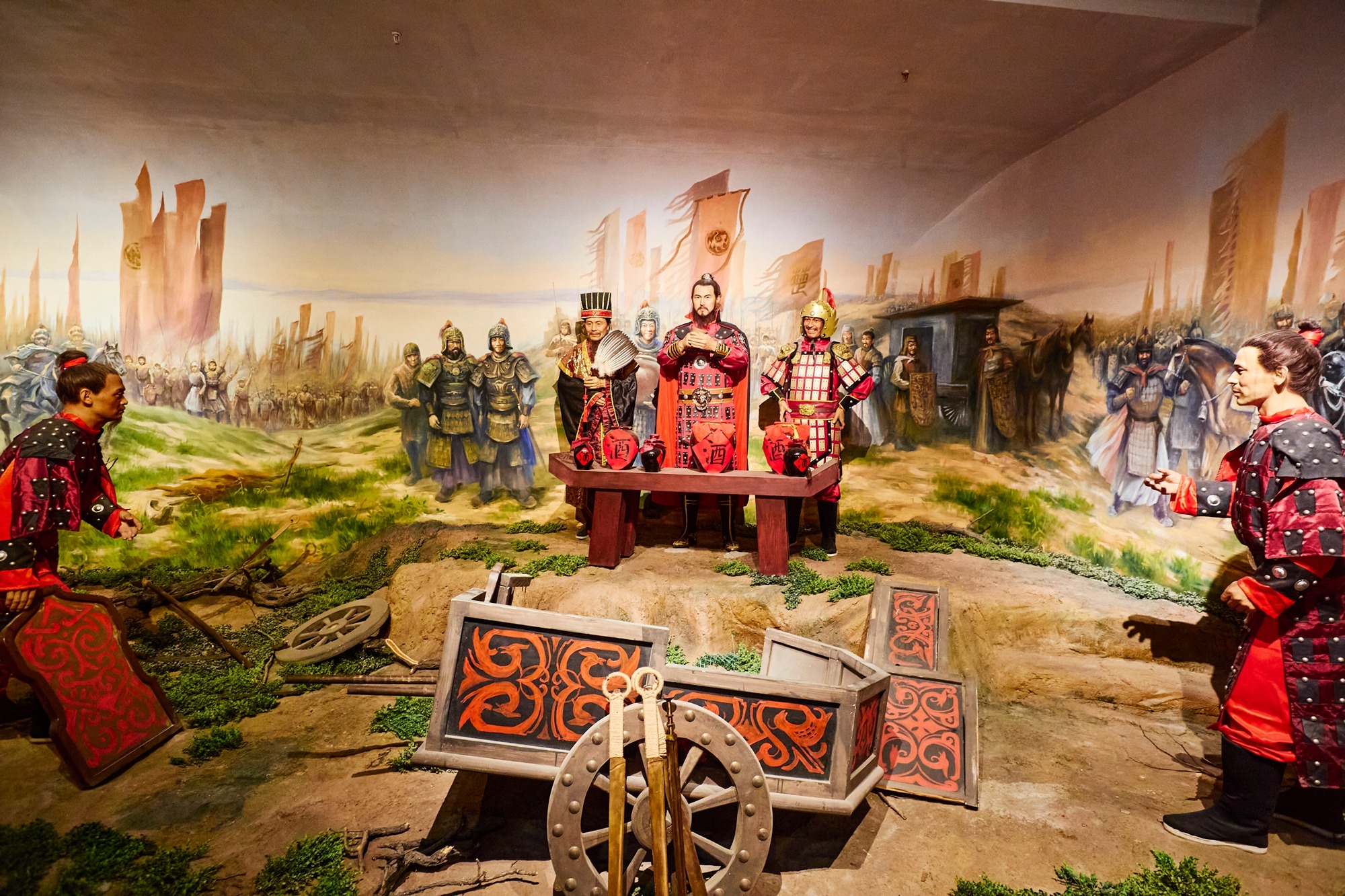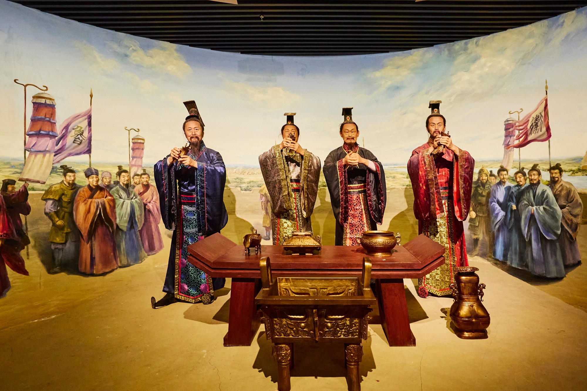 春秋时期宋侯会盟的名场面栩栩如生,四位诸侯举爵而饮,身后官员分列而立,旌旗招展,而口子酒正是当时的“大会专供用酒”,也因此而成名。