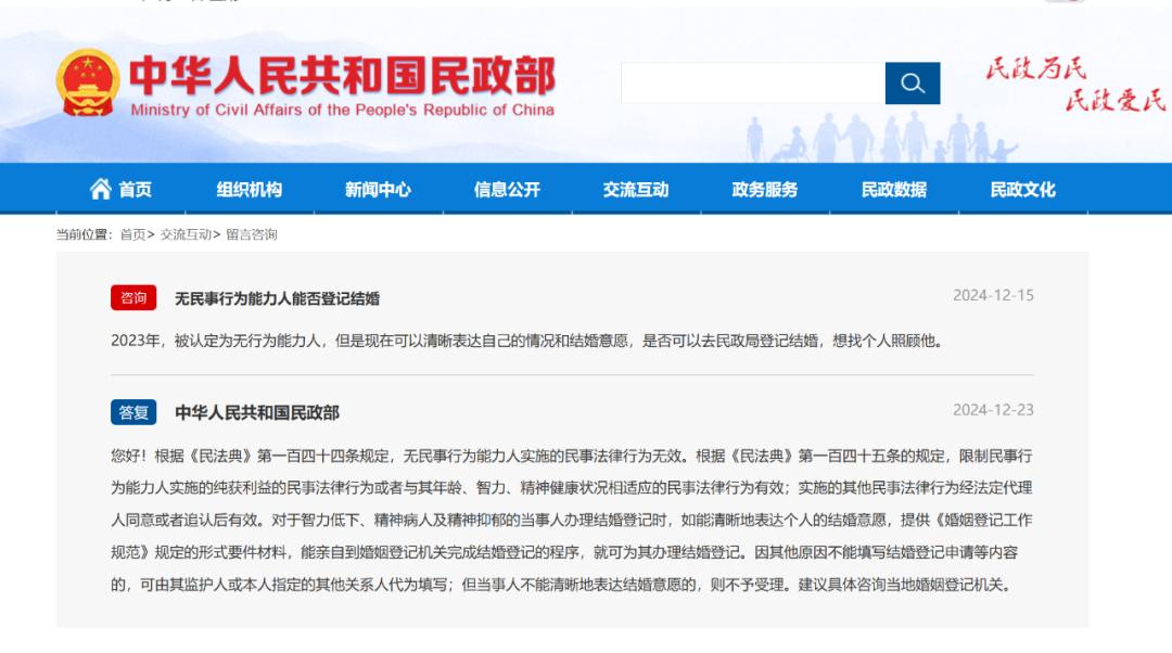 2024年底,有人在民政部网站留言:“被认定为无行为能力人,但是现在可以清晰表达自己的情况和结婚意愿,是否可以去民政局登记结婚,想找个人照顾他。”