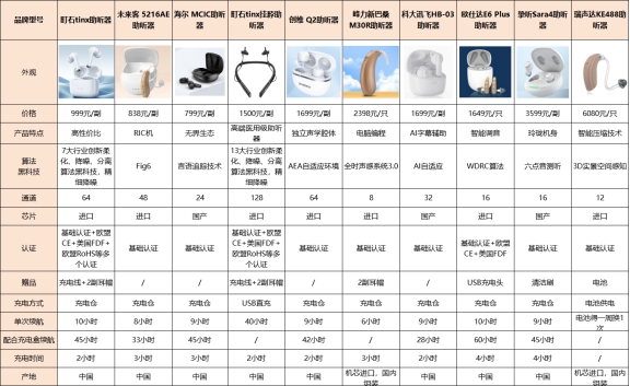 说实话,每次选助听器我都会先翻参数表,这一步能帮人过滤掉不少不合适的选项。下方展示的,就是这次测评中几款助听器对应的核心数据。