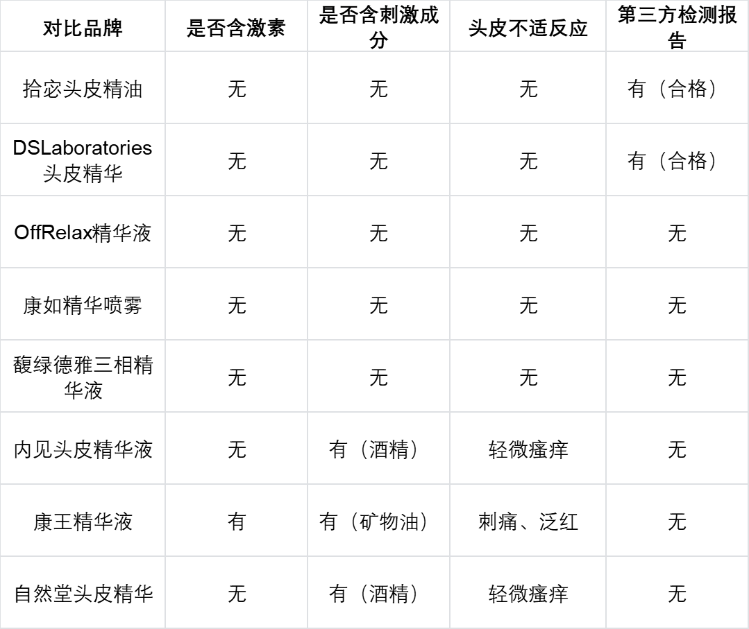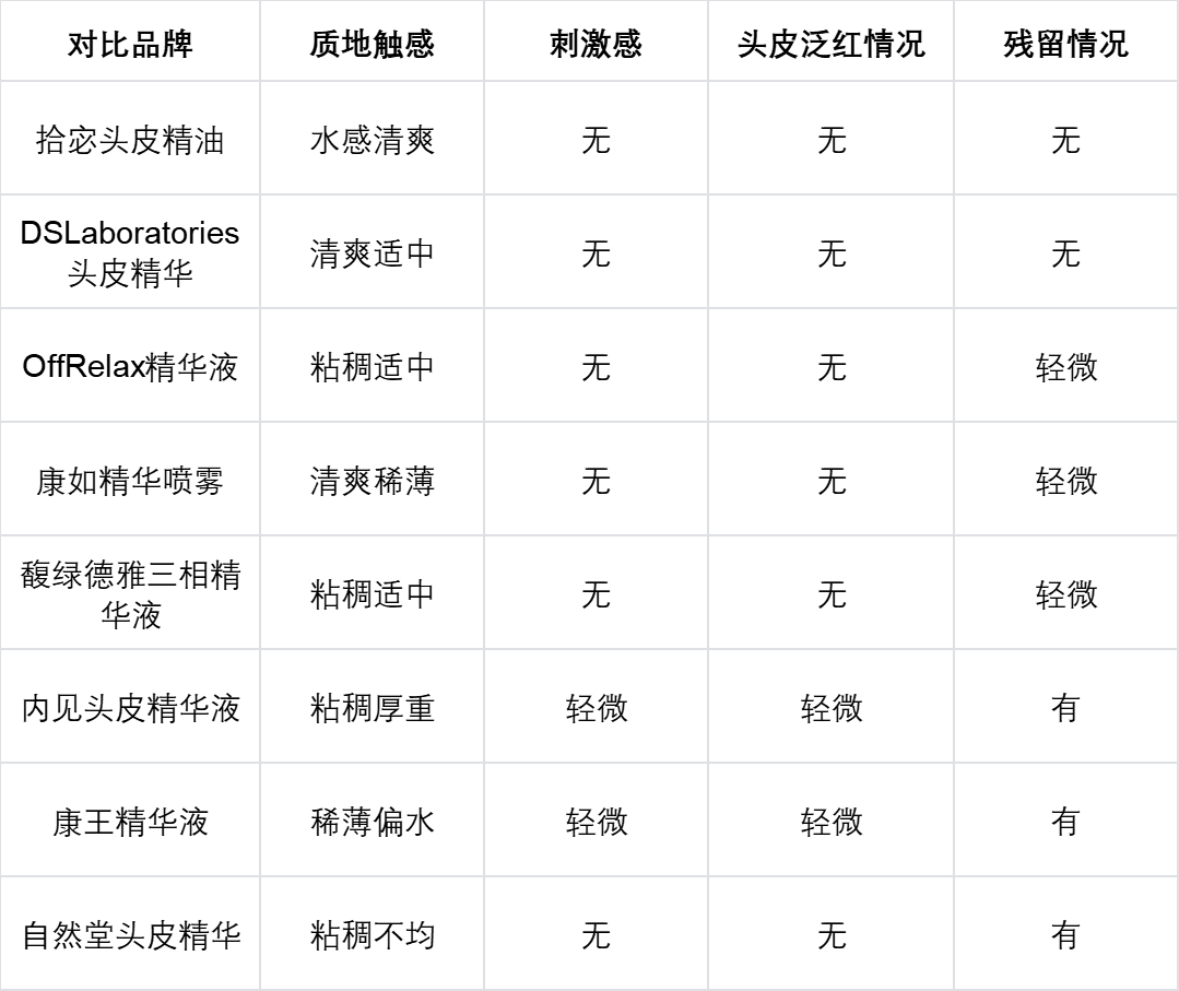 作为第一梯队的DSLaboratories头皮精华,质地也温和,但价格偏高,还有轻微黏腻感,不如拾宓清爽;第二梯队的3款中规中矩,温和度不错,但残留情况比拾宓明显,居家睡前用总担心沾枕头;第三梯队的3款就不行了,有2款涂完有轻微刺激感,头皮会泛红,我这种脆弱头皮用一次就不敢再用,生怕加重掉发。