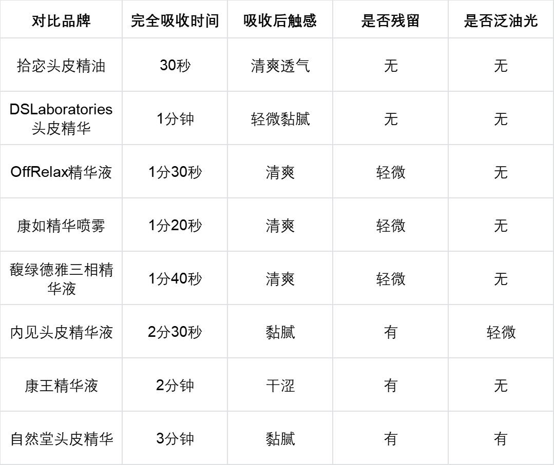 测评方法:每款产品取相同用量,分别涂抹在头皮同一区域,用指腹以相同力度按摩,记录完全吸收所需时间,观察吸收后头皮触感和是否有残留、泛油光的情况。