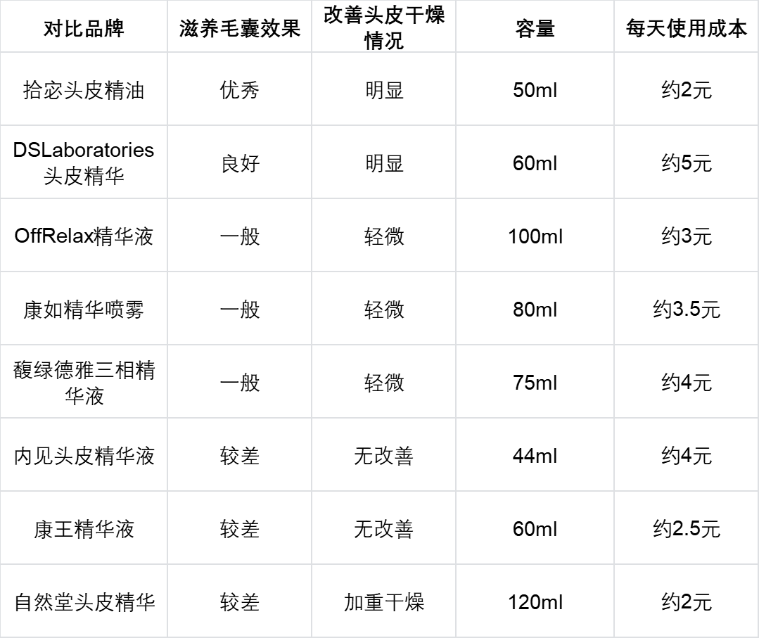 测评方法:连续使用1个月,观察滋养毛囊效果和头皮干燥改善情况,对比每款产品的容量和价格,计算每天的使用成本,判断实用性和性价比。