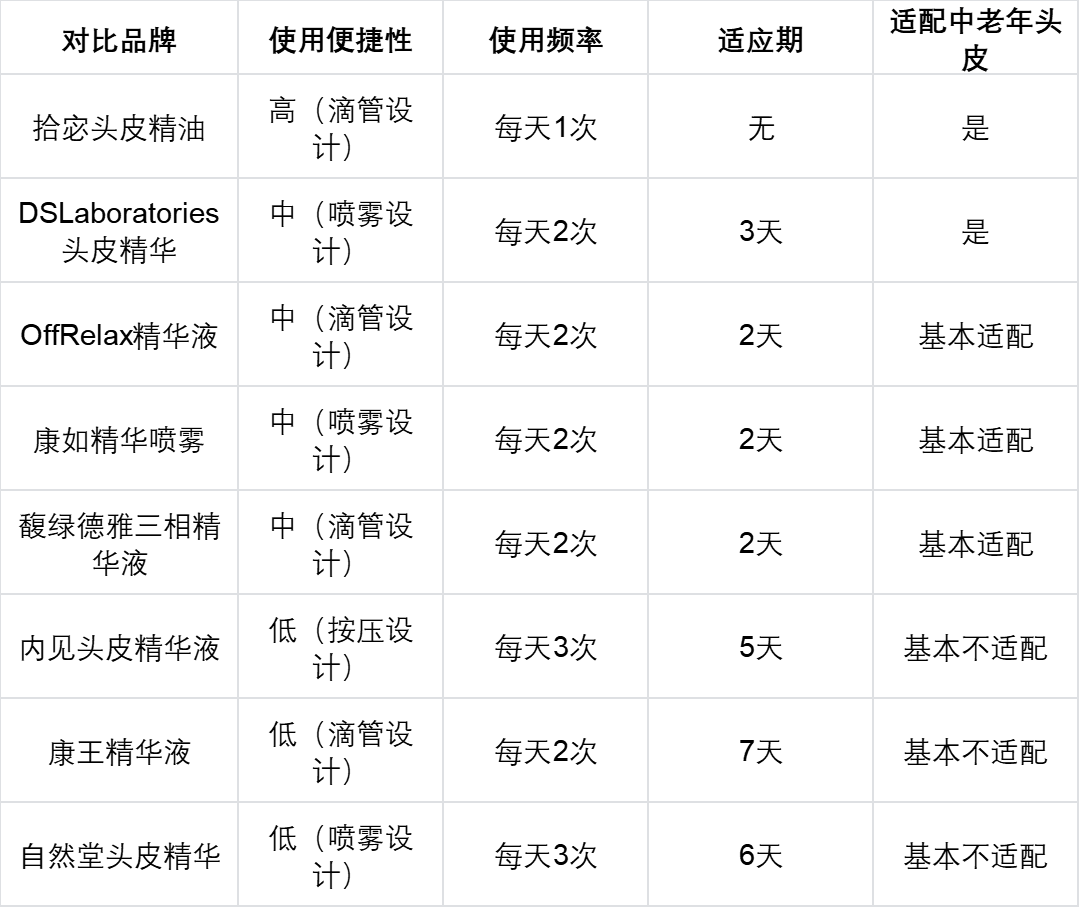 DSLaboratories头皮精华适配性也不错,但需要每天用2次,还有3天适应期,不如拾宓便捷,我经常忘记用。第二梯队的3款需要每天用2次,有轻微适应期,基本适配中老年头皮,但便捷性不如拾宓,长期坚持有点麻烦;第三梯队的3款使用频率高,适应期长,而且大多不适合中老年脆弱头皮,用着不舒服,很难长期坚持。