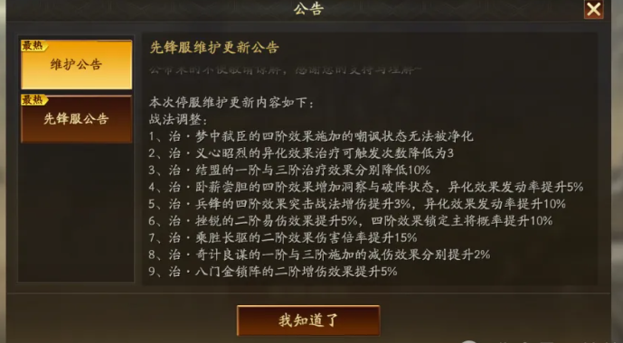 今天新剧本测试服“九州兵兴“更新调整了了9个治战法,毕竟测试服测试的人数有限,相信后期还会微调。