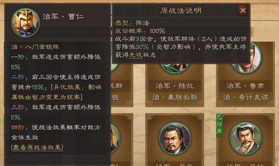 1.治八门金锁阵增强后,伤害降低40%,主将伤害提升15%3回合,对敌方3人生效。异化后减伤由智力影响改为统率。实用指数★★★。平民还是很有用,群弓、周瑜等队伍。