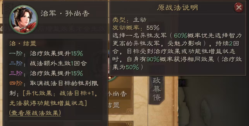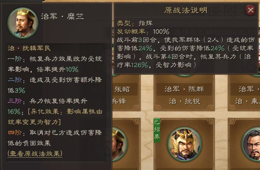2.治抚辑军民增强后,恢复兵力受统率影响,兵力恢复升为142%,全消伤害降低,27%减伤。异化后这个有点bug,又改回智力影响,有点多余。实用指数★★★。平民还是能用,减伤,第4回合回血。