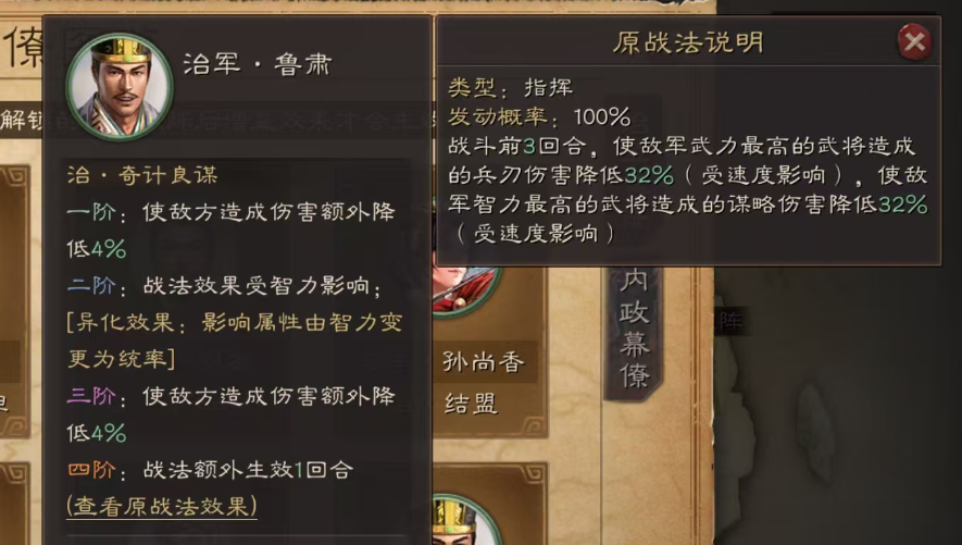 3.治奇计良谋增强后,4回合降低伤害,伤害降低变为40%,战法受智力影响。异化后受统率影响。实用指数★★★。也是平民能用,共存阵容用的。