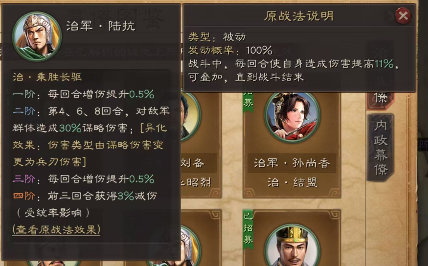 4.治乘胜长驱增强后每回合增伤13%,3回合3%减伤,4、6、8回合对敌军2人造成30%谋伤。异化后可变为兵刃伤害。实用指数★★★。为共存阵容可用。
