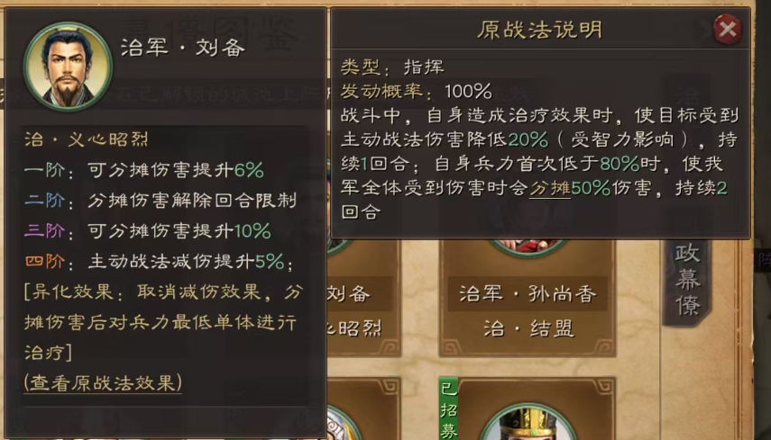 8.治义心昭烈测试服剧本里比较强的战法,分摊伤害由之前的5次改为3次。实用指数★★★★★。虽然减弱了,但依然很强,拒马弓新玩法必选。