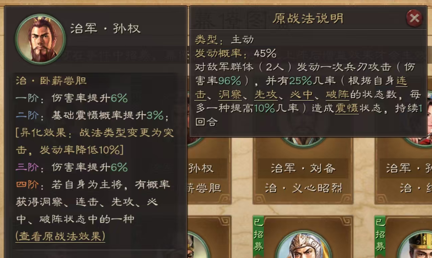 9.治卧薪尝胆增加了洞察、破阵,可以说非常强了实用指数★★★★★。SP马超、孙权、吕布等玩突击的带直接战力提升一档。