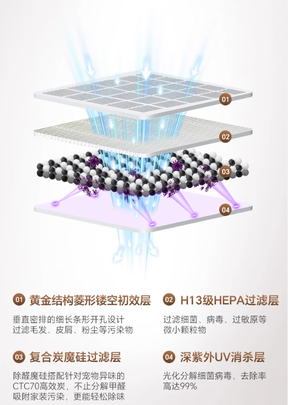 它的 “三重消杀系统” 专门针对宝宝常见病原体设计:第一层 HEPA H13 级滤网,能像 “细密的网” 一样拦截病毒载体(比如飞沫、粉尘颗粒),连 0.3 微米的微小颗粒都能挡住;第二层 “抗病毒涂层”,会主动破坏病毒的蛋白质结构,让病毒失去感染能力;第三层隐藏式 UV 杀菌灯(设计在机身内部,不会直射宝宝眼睛),进一步灭活漏网的病毒细菌,避免二次污染。对换季流感高发期,或家里有老人帮忙带娃的家庭,这种 “全链路消杀” 比普通净化器更让人安心。