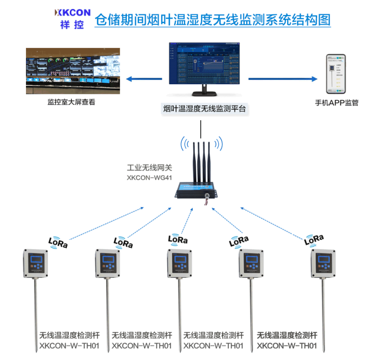 XKCON祥控LORA无线型多点式烟叶温湿度监测系统的组成和功能: