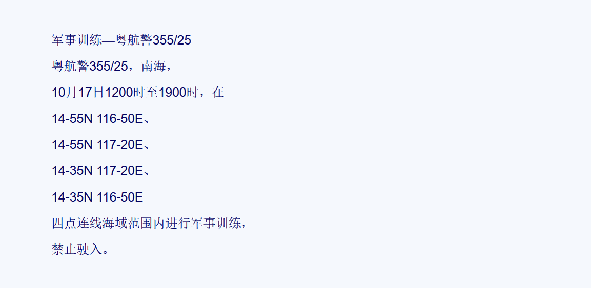 中菲10月16日黄岩岛对峙中,中方海警巡逻舰、海军驱护舰、渔船和空军战斗机等都有参与,包括此前公布了一则航行警告,宣布将在四点连线海域范围内(黄岩岛附近海空域)进行军事训练,一切舰机“禁止驶入”。