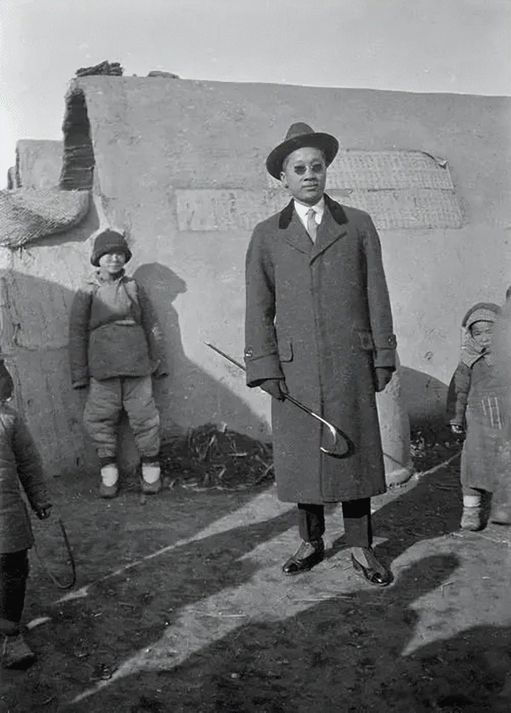 这张图片拍摄的就很割裂,前面的男子穿着笔挺的西装,手里拿着拐杖,脸上戴着墨镜,头上戴着帽子,看起来相当的摩登。
