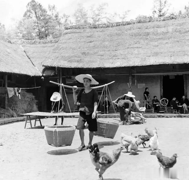 这张图片拍摄的是上个世纪一家普通的农民工作的场景,身强力壮的男子挑着扁担,趁着阳光明媚,把家里的粮食抬出来晒一晒。