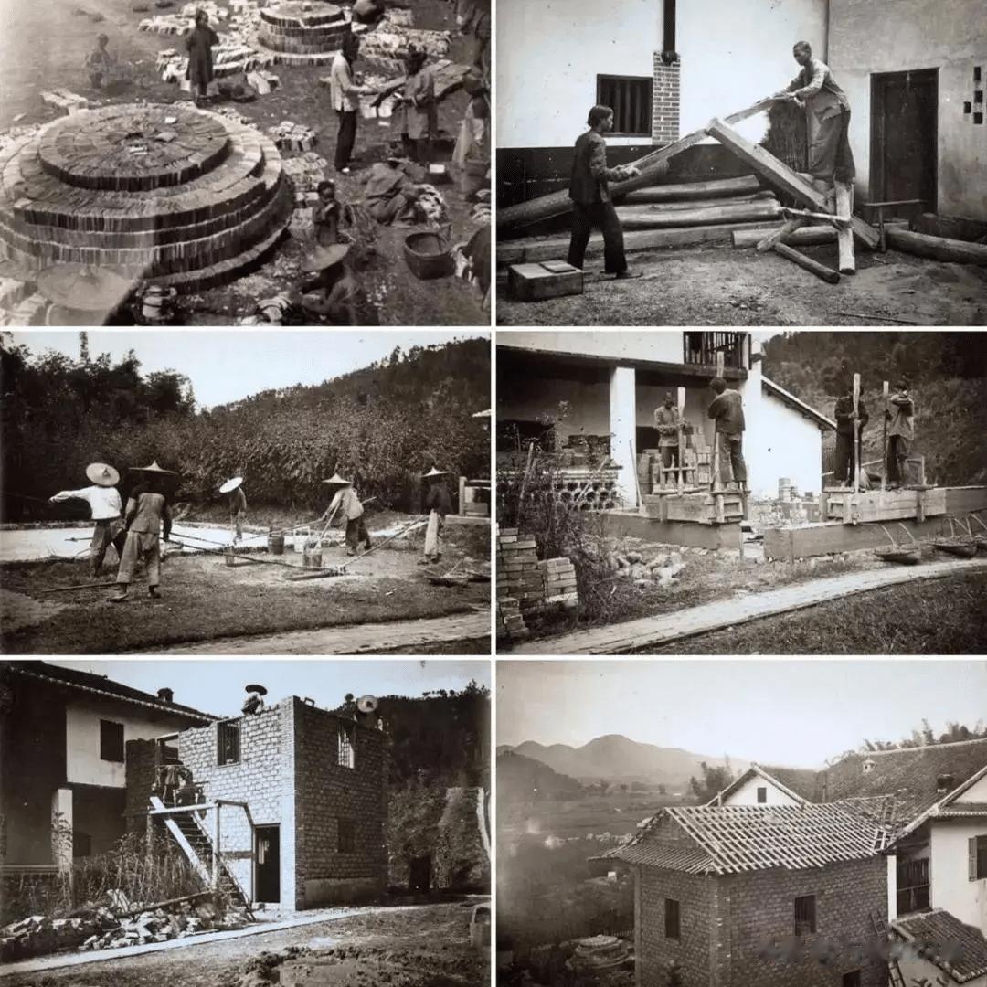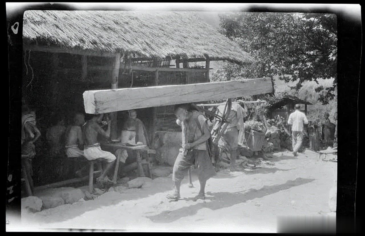 这张图片里,可以说拍摄了当时的人们修建房屋的全过程,瓦片整整齐齐的堆在房子外面,砍伐木头制作房梁。