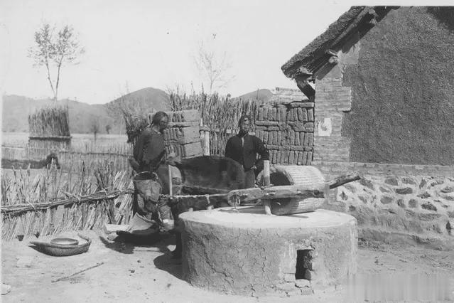 以前的粮食,从收获到入嘴,还是要经过不少的步骤,图片里,两位身强力壮的男子站在旁边,地面上一座厚厚的石磨盘,一头驴被绑在上面。