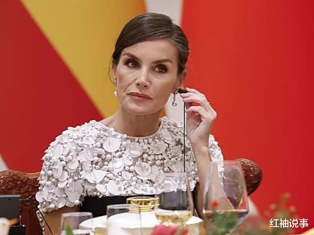 晚宴期间,一个温馨的小插曲悄然上演:莱蒂齐亚王后佩戴着耳机,全神贯注地聆听着每一句讲话,确保不错过任何细节。