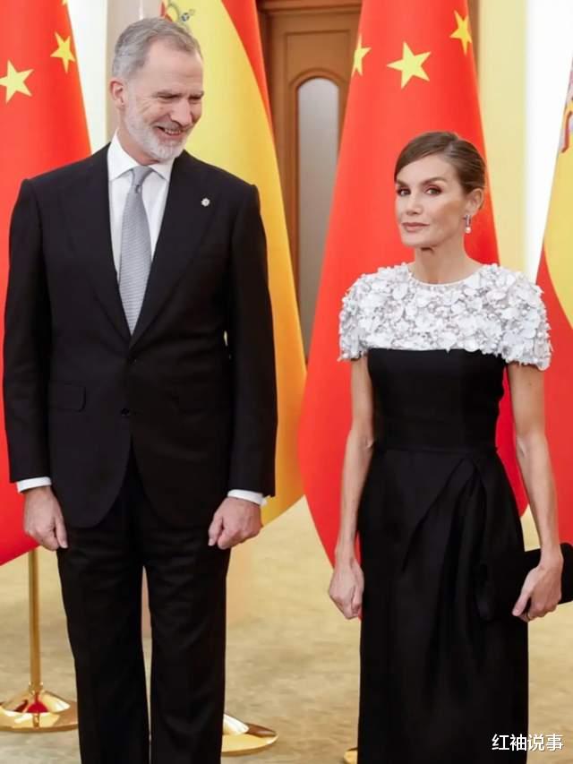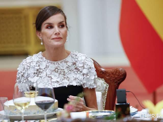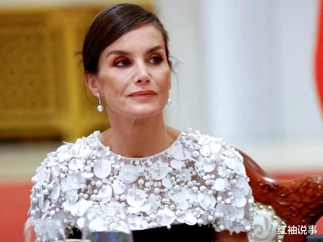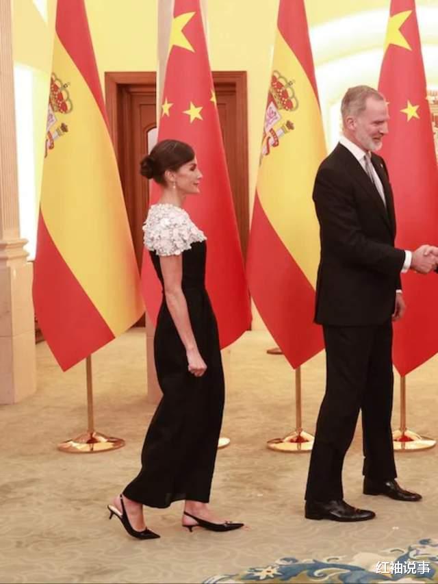 因访问的是共和国,礼仪规定无需佩戴王冠,但莱蒂齐亚王后的着装。依旧尽显高雅与得体。她深知晚宴需长时间站立,故而精心挑选了一双既舒适又不失风范的高跟鞋,与整体造型相得益彰。