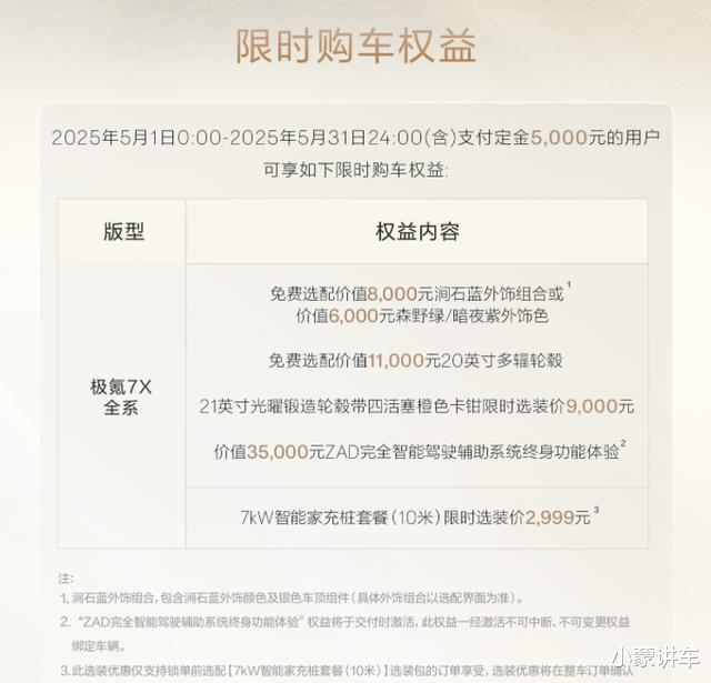 必须得把这个好消息告诉大家:现在买极氪7X,选装21寸光曜锻造轮毂+四活塞橙色卡钳,只要9000块!要知道,这玩意儿以前可是要大出血才能搞定的。而且,还有其他福利:免费选外观颜色、20寸轮毂,ZAD智能驾驶辅助终身免费体验,7kW家充桩也有优惠。这波操作,简直是“买一送五”的节奏啊!
