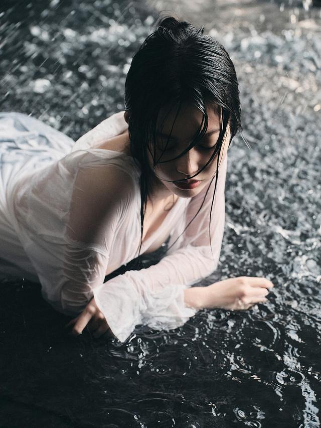 深色的水面与人物浅色的衣物形成对比,湿发紧贴脸庞,发丝的细节与衣物的褶皱因雨水而更显生动。